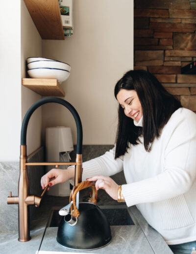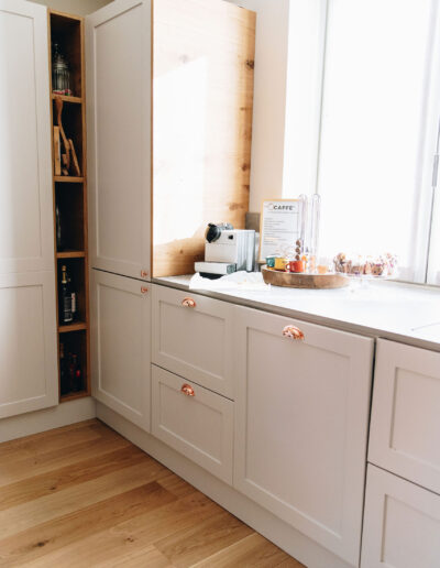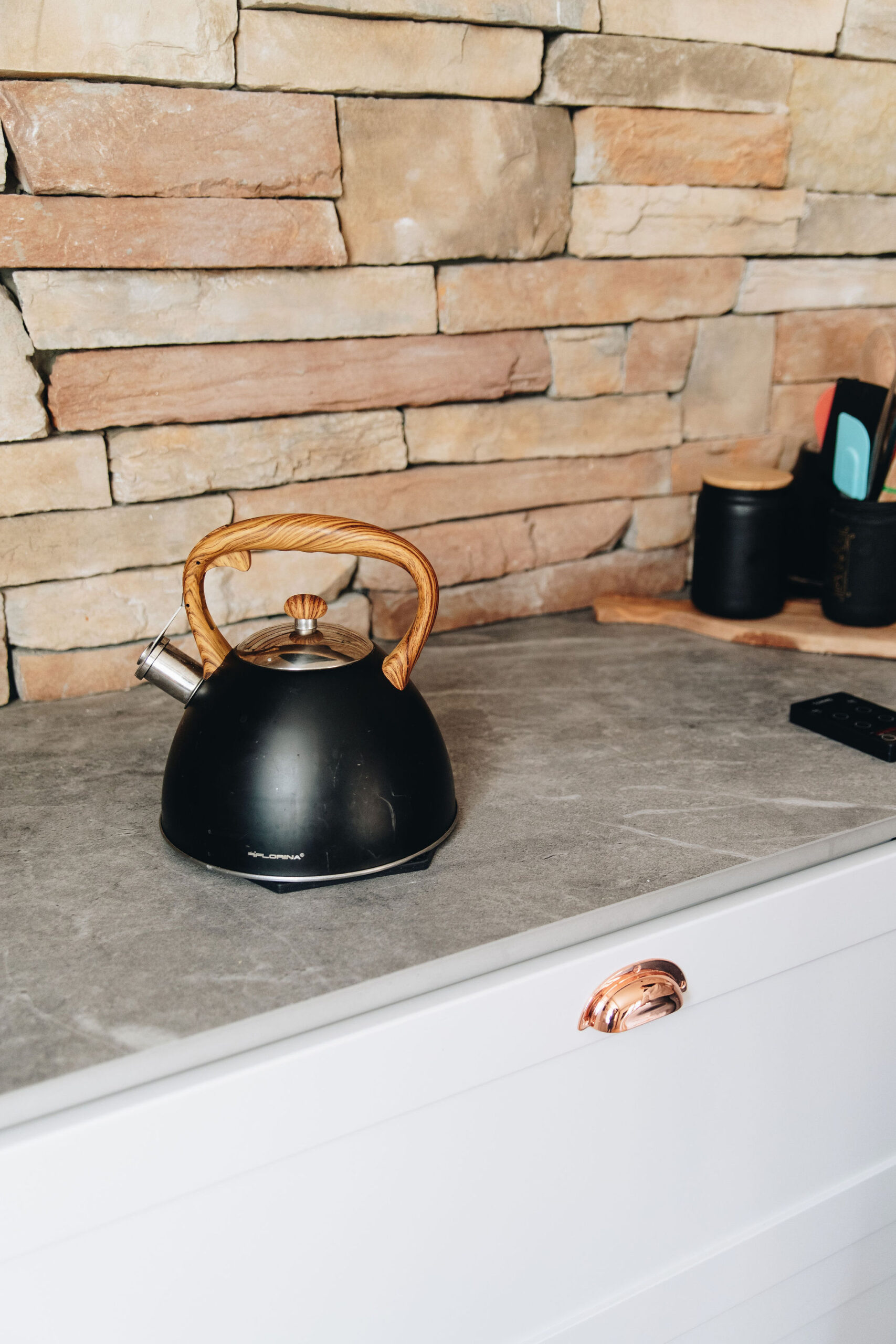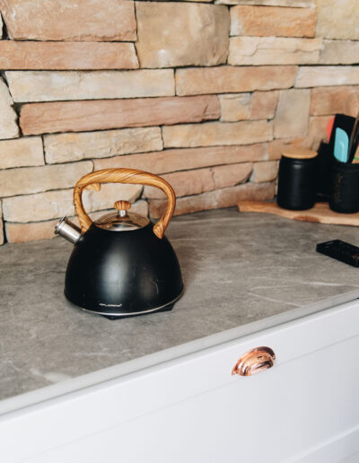 Recupero Consapevole: In pieno spirito Roots, la cucina è stata evoluta, non demolita. Abbiamo mantenuto la struttura, raddoppiato il piano di lavoro e rifatto i frontali in stile Farmhouse, con un top in gres effetto pietra grigio e induzione sottotop. La preesistente parete in pietra naturale è stata mantenuta come paraschizzi, ponte materico tra passato e presente.