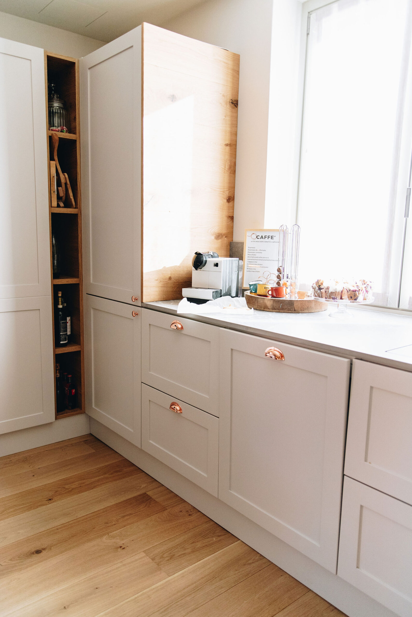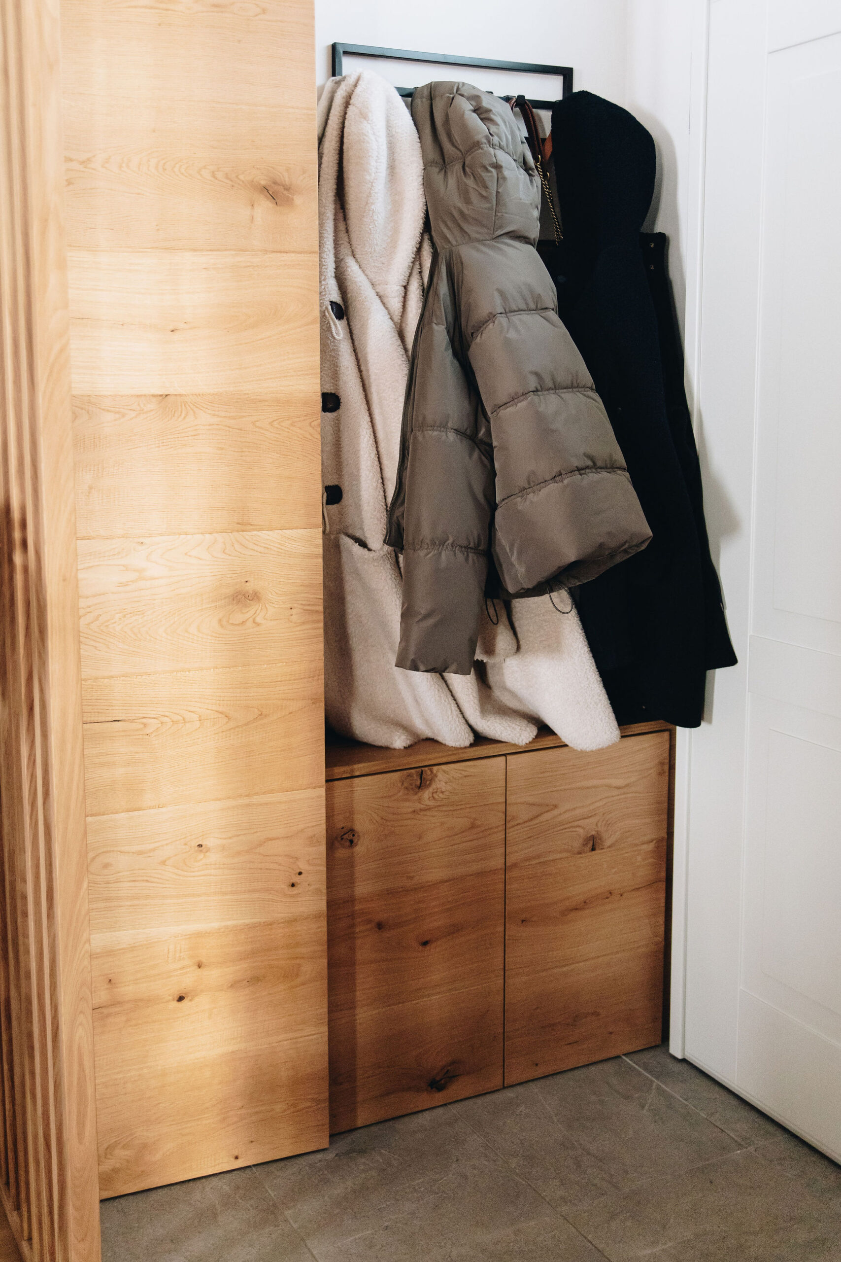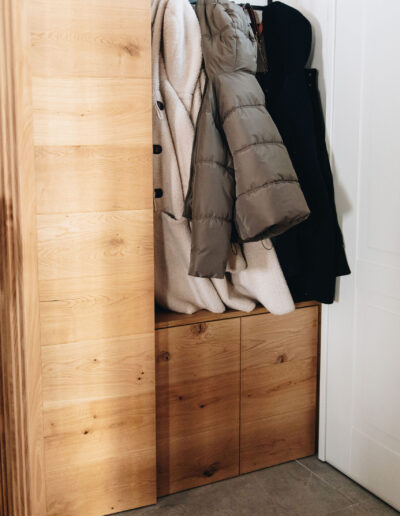 Continuità Materica: Il Rovere Naturale è il filo conduttore che non si ferma mai. Riveste la parete d’ingresso e la zona TV (mimetizzando un armadio contenitore), ma prosegue con rigore in cucina, sia a pavimento che nei dettagli: fianchi delle basi e mensole sono coordinati alle scaffalature dell’ufficio, creando un’armonia visiva totale.