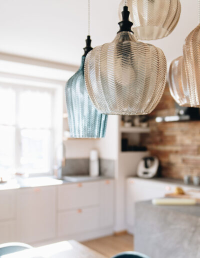 La Sfida Vintage (I Lampadari): L’elemento che ha richiesto la ricerca più estenuante. Questi pezzi sono il vero punto di sutura del design: attraverso le loro sfumature di azzurro, beige, marroncino e i supporti neri, riescono a sintetizzare e far vibrare l’intera palette cromatica della casa.