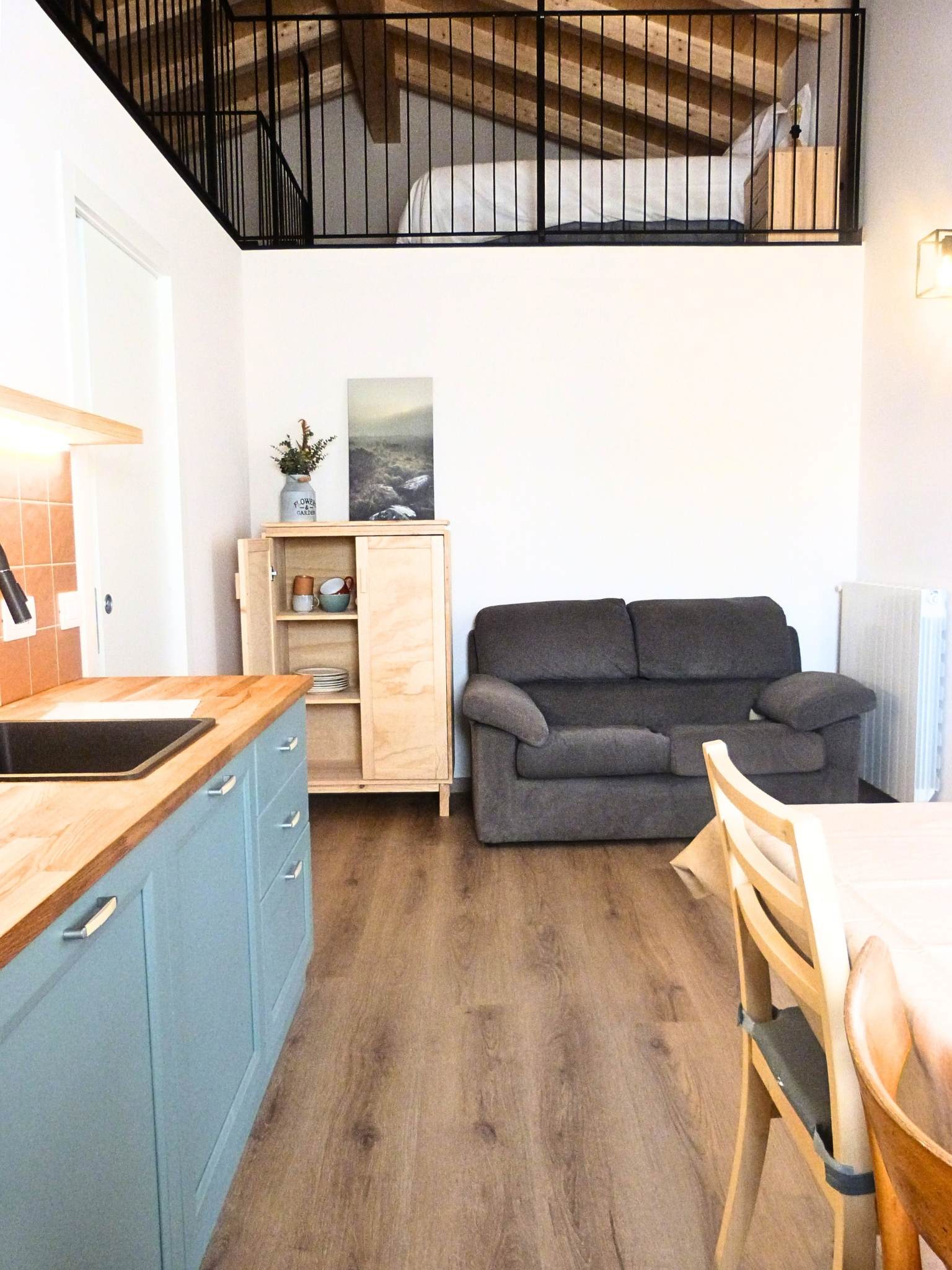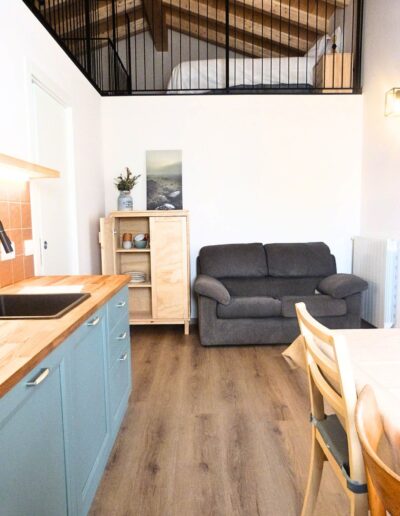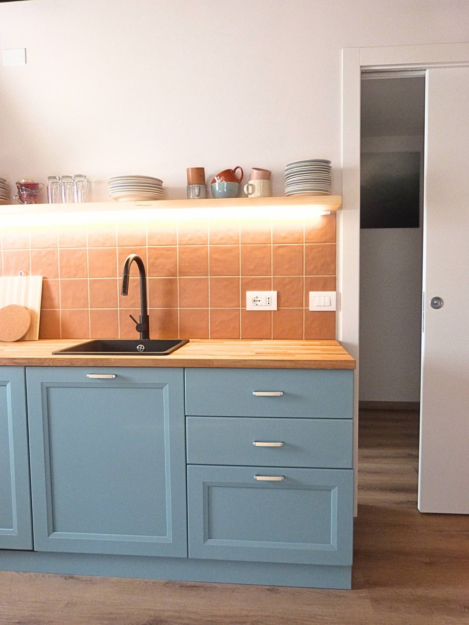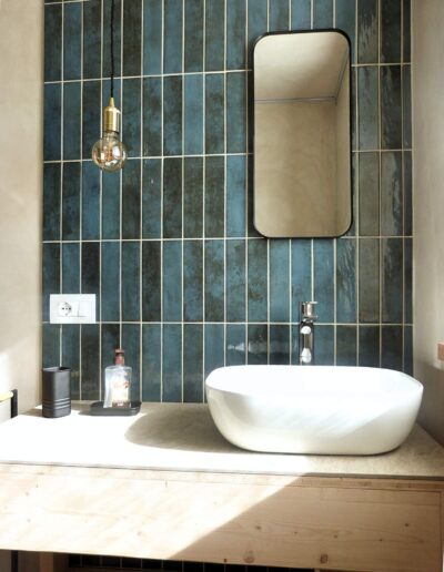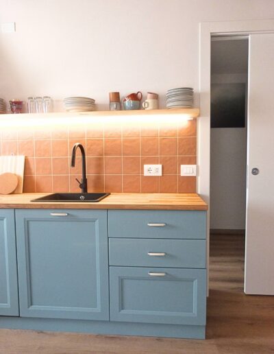 - Palette Cromatica: Una base luminosa di Bianco Caldo che fa risaltare i toni decisi del territorio. Il carattere della casa è definito dall’Azzurro Acqua della cucina e dal Blu Profondo delle ceramiche nel bagno, scaldati dal tono Terracotta dei dettagli materici.