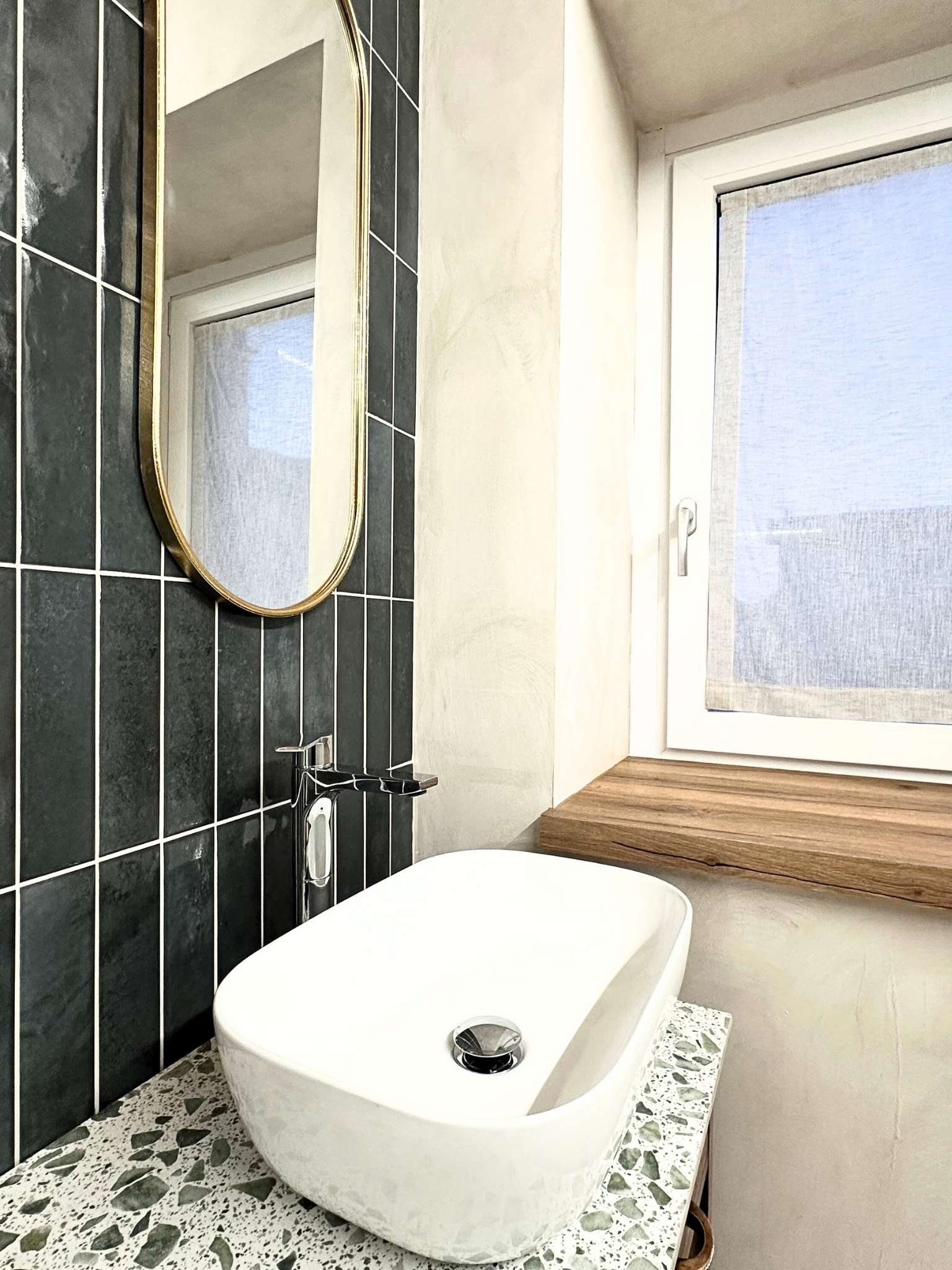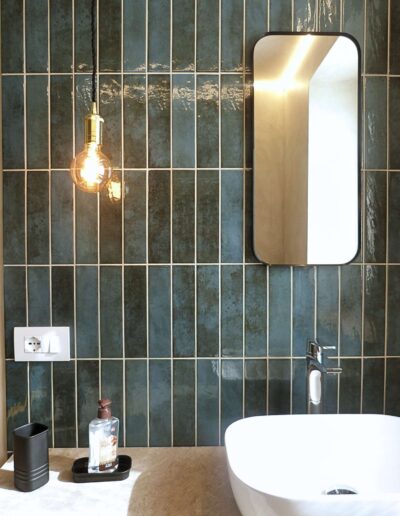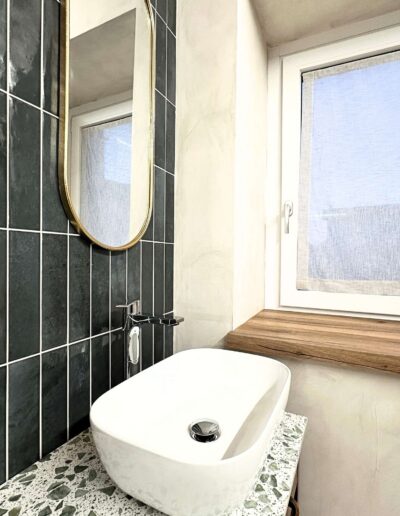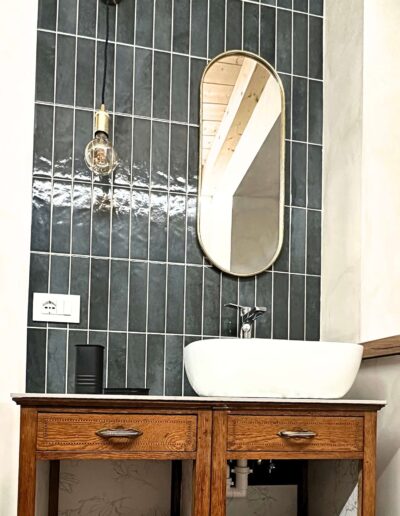 L’Elemento Roots: La cura artigianale si rivela negli schemi di posa delle ceramiche 10×26, che elevano il formato classico a dettaglio architettonico, nel mobile bagno trasformato con top in graniglia e interni in carta da parati e nel tavolo, recuperato da una cucina di campagna.