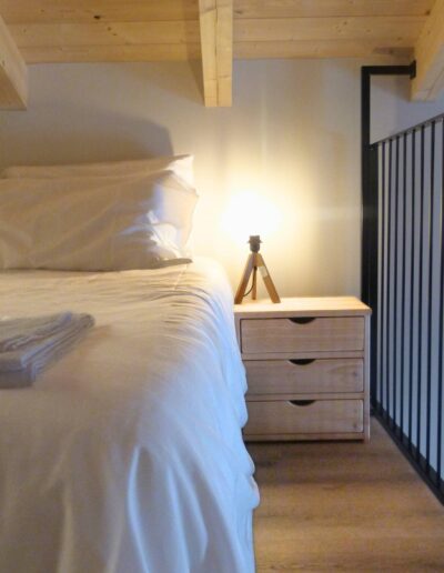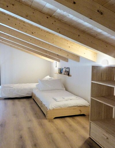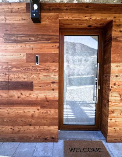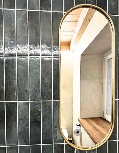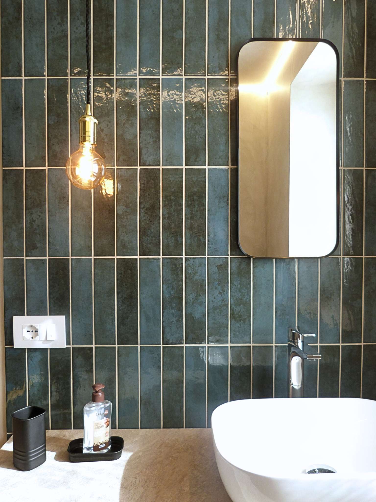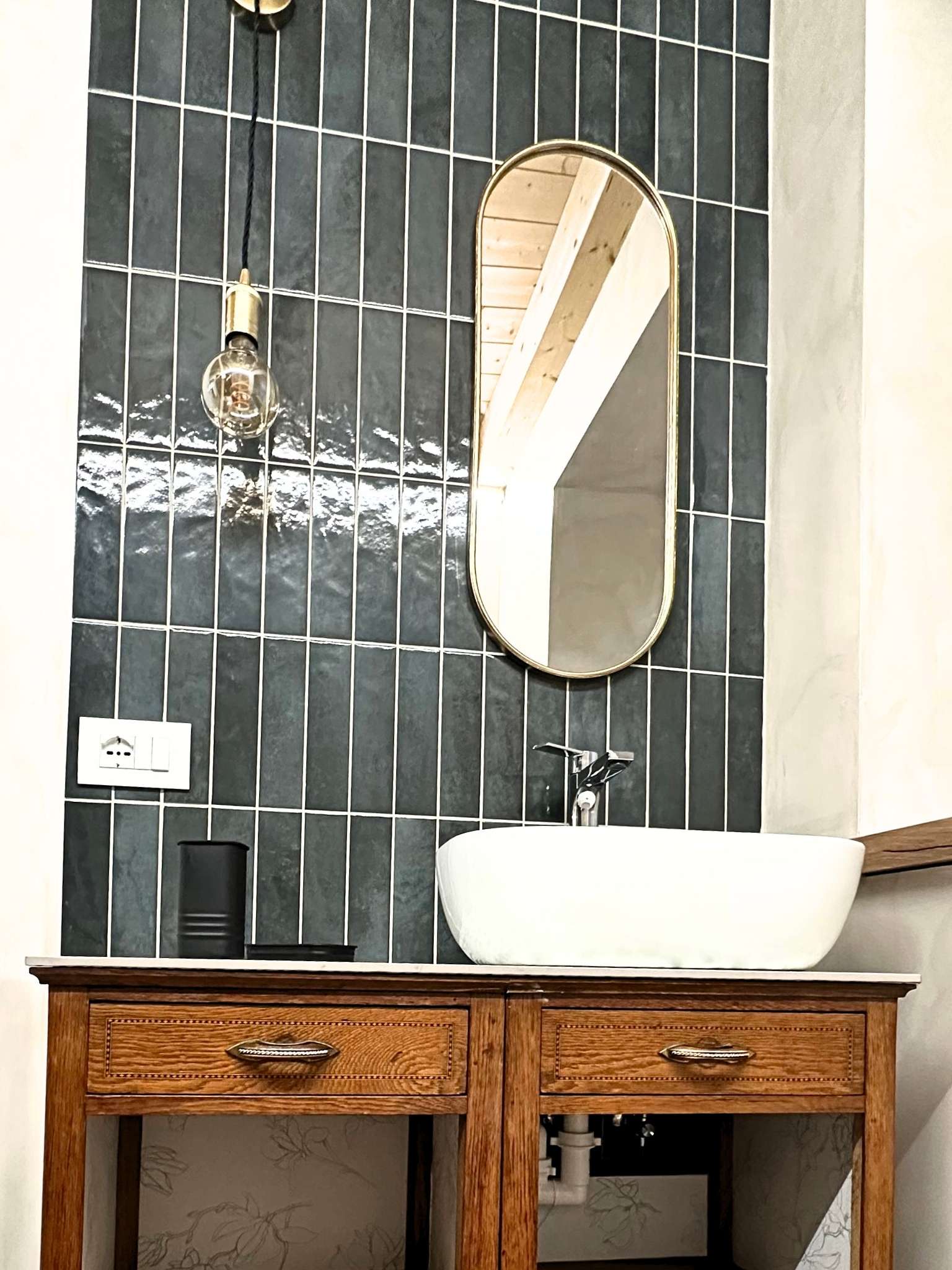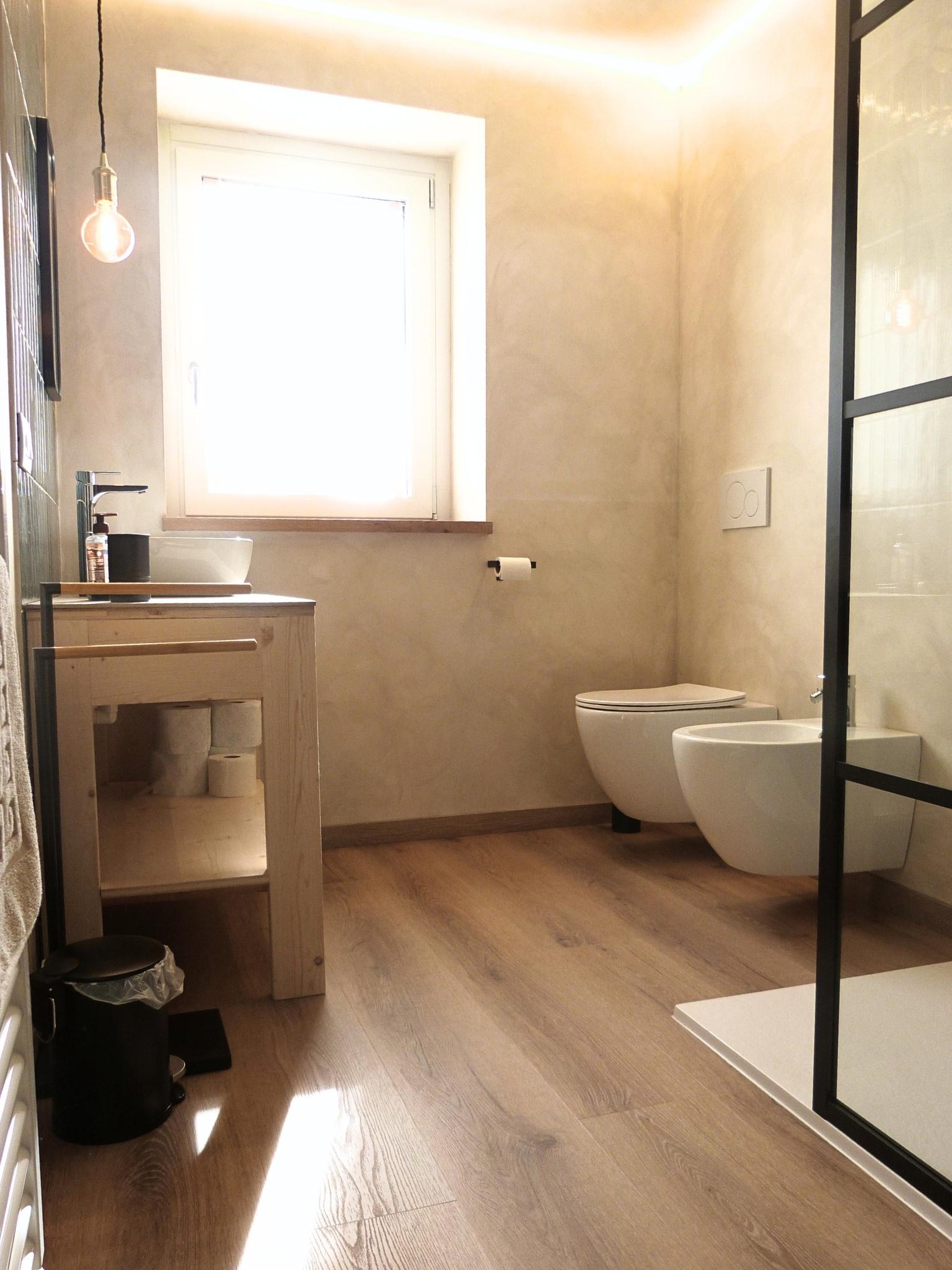 - Materiali & Contrasti: Il calore dell’abete naturale degli arredi dialoga con le finiture contemporanee in nero opaco di lanterne, rubinetterie e profili. Il top in gres effetto pietra del mobile bagno (realizzato su misura) aggiunge una nota materica e resistente.