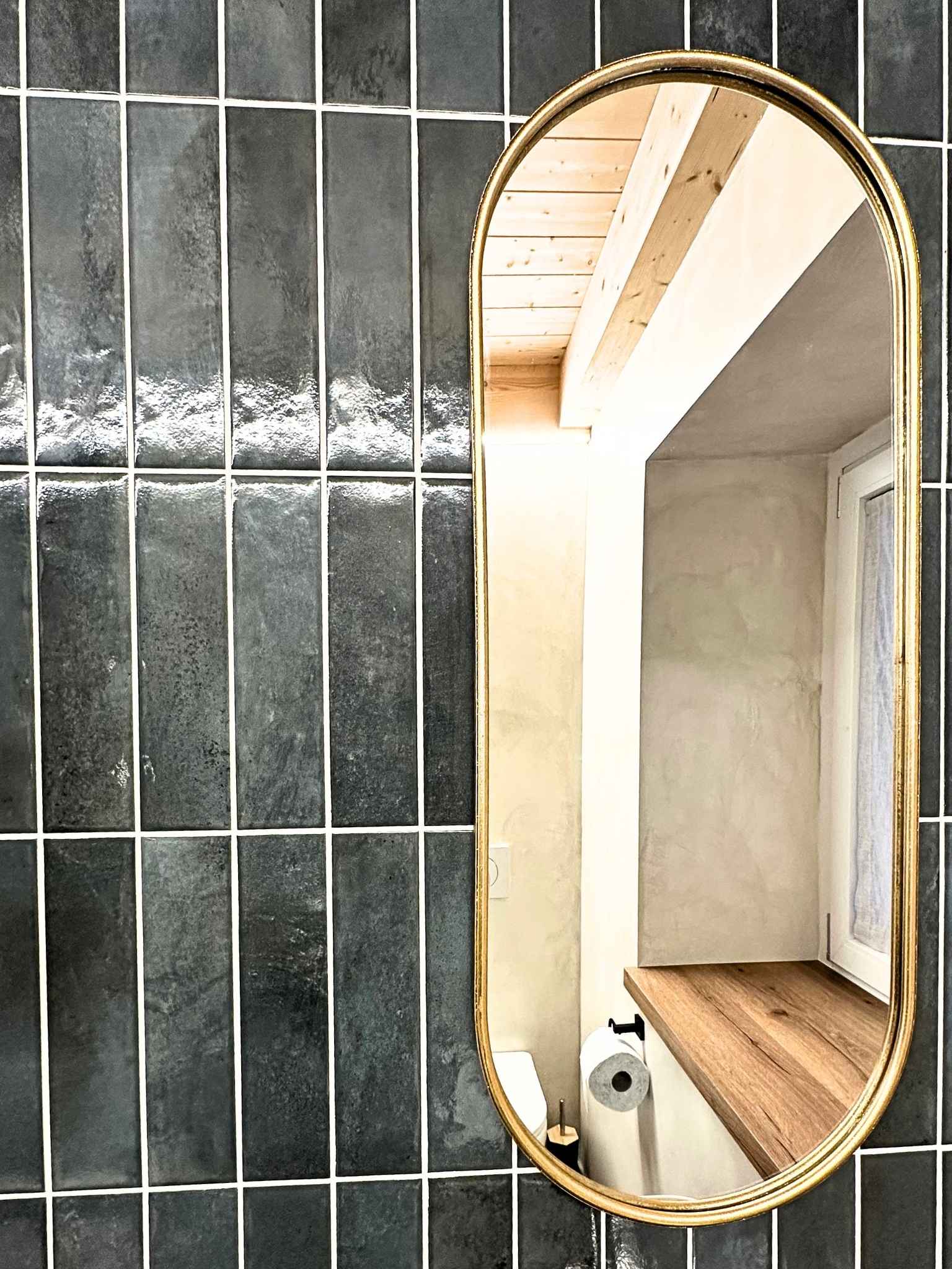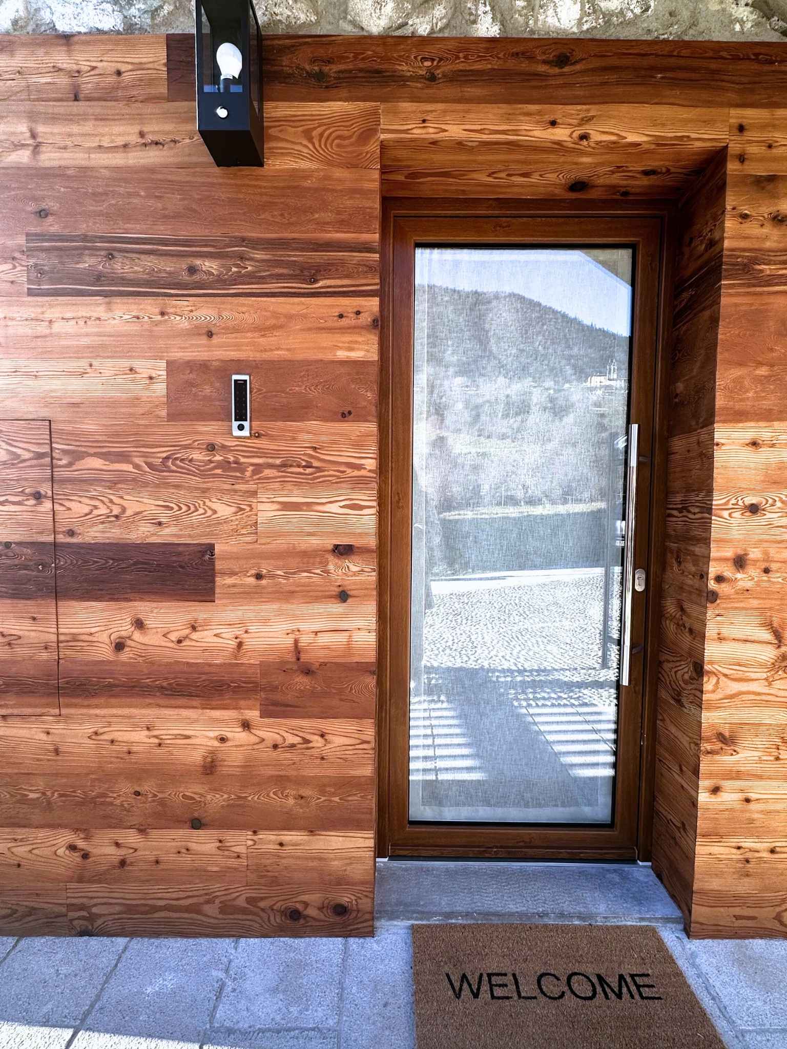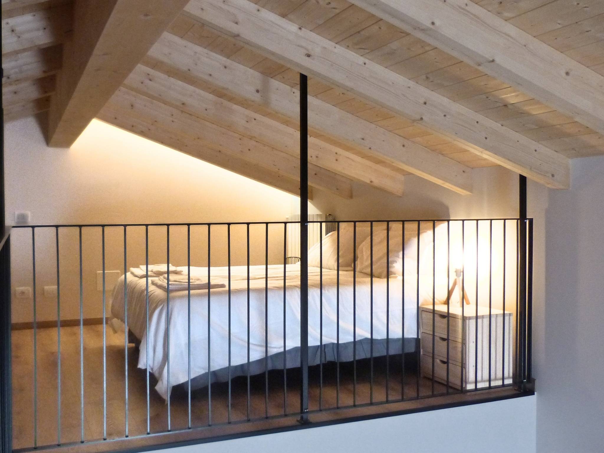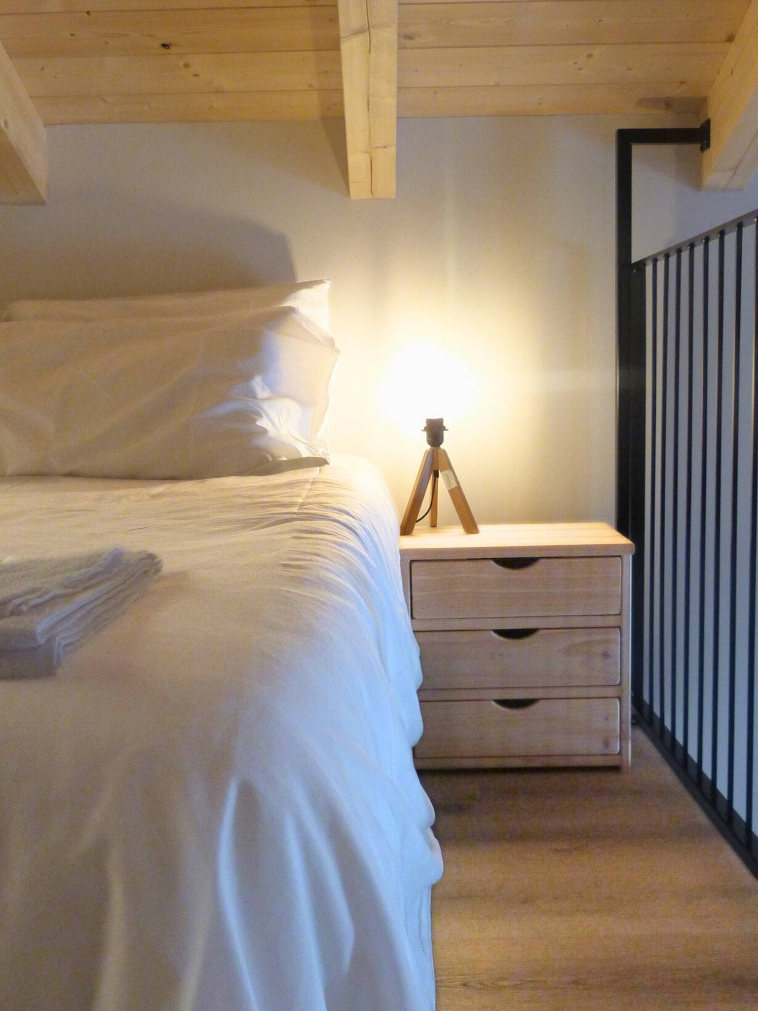 - Materiali & Contrasti: Il calore dell’abete naturale degli arredi dialoga con le finiture contemporanee in nero opaco di lanterne, rubinetterie e profili. Il top in gres effetto pietra del mobile bagno (realizzato su misura) aggiunge una nota materica e resistente.