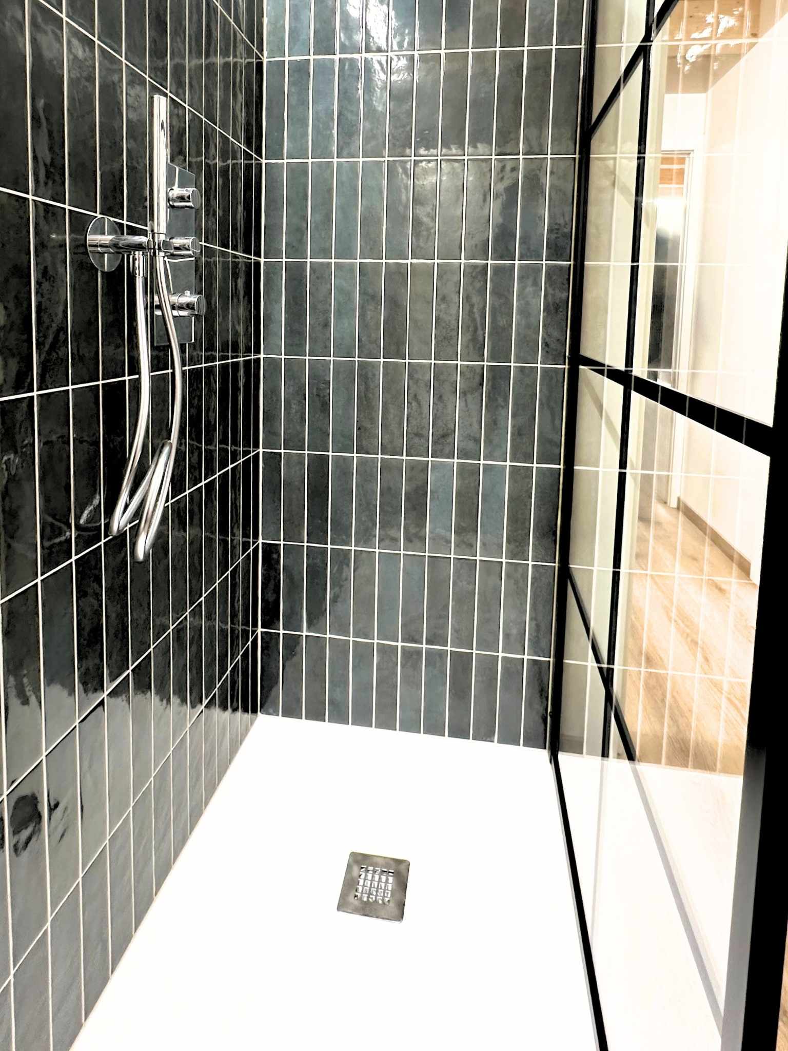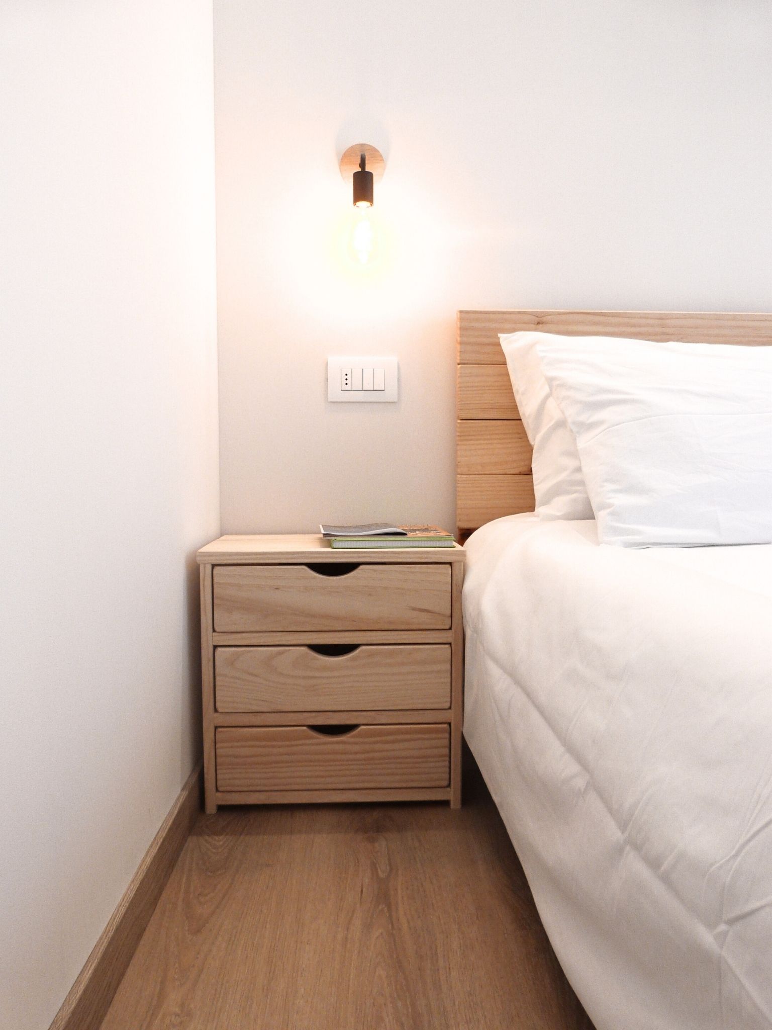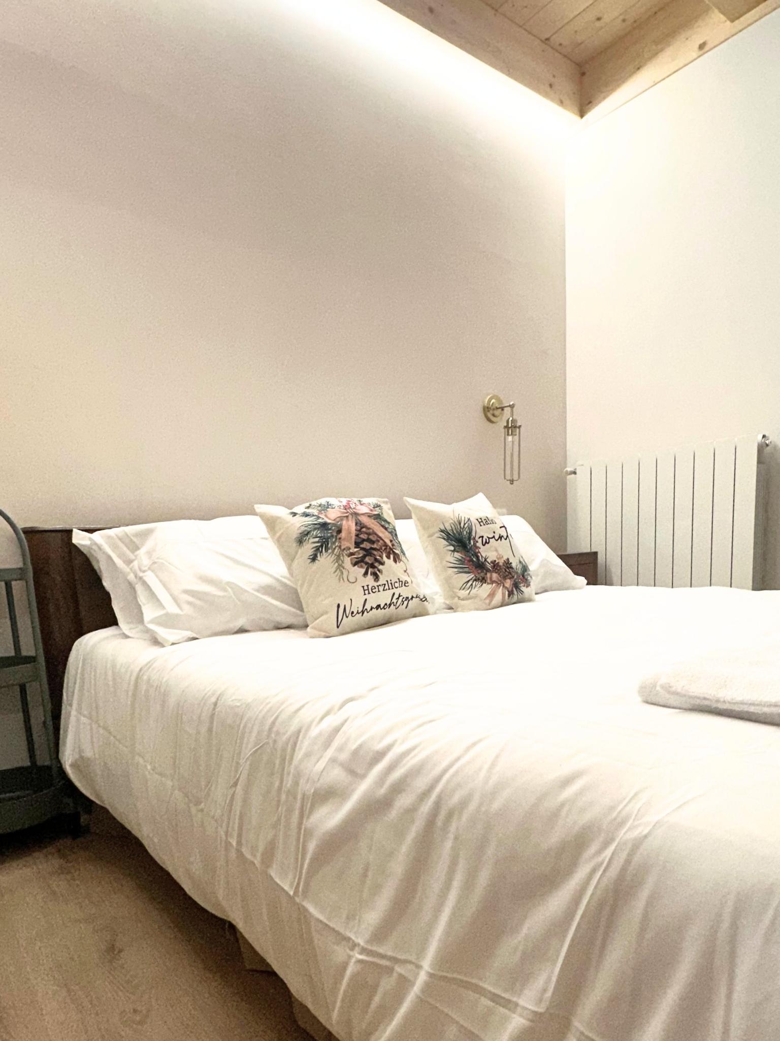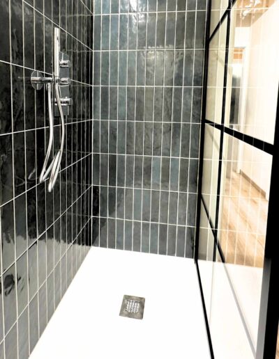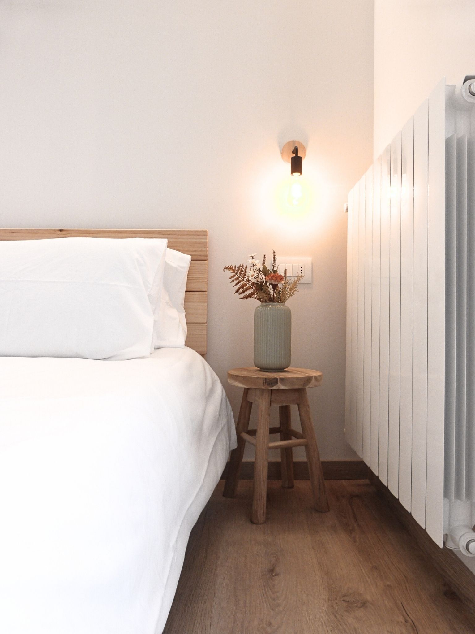 - Materiali & Contrasti: Il calore dell’abete naturale degli arredi dialoga con le finiture contemporanee in nero opaco di lanterne, rubinetterie e profili. Il top in gres effetto pietra del mobile bagno (realizzato su misura) aggiunge una nota materica e resistente.