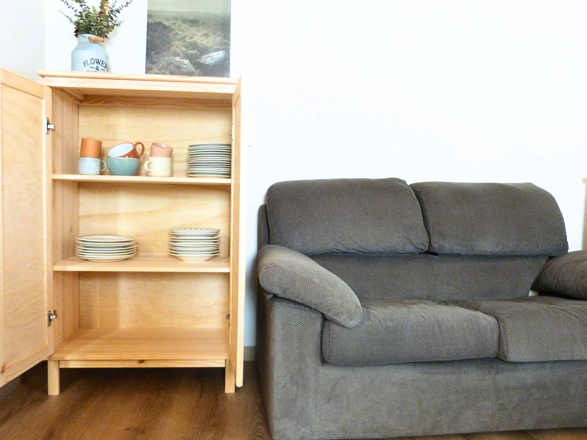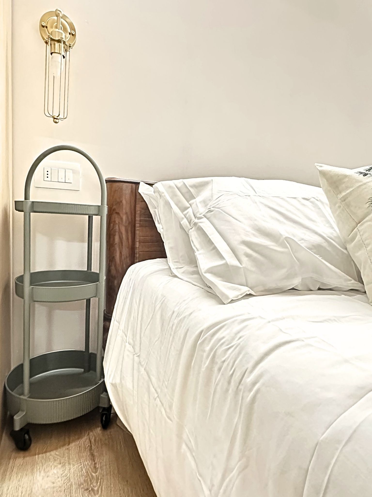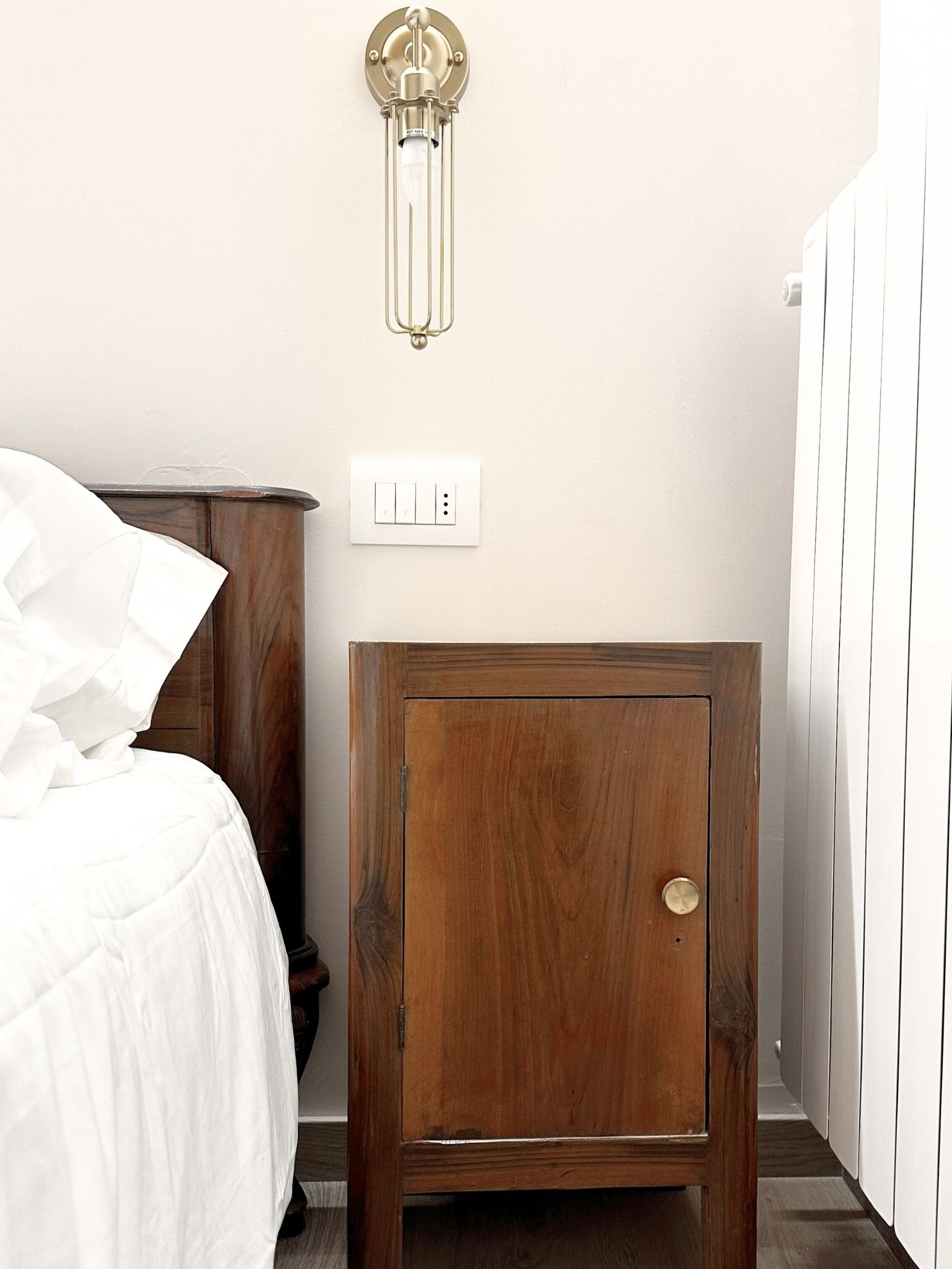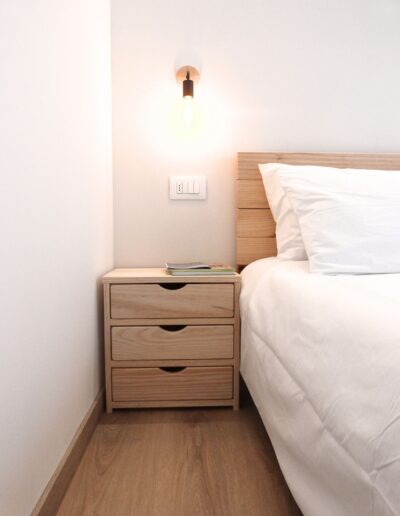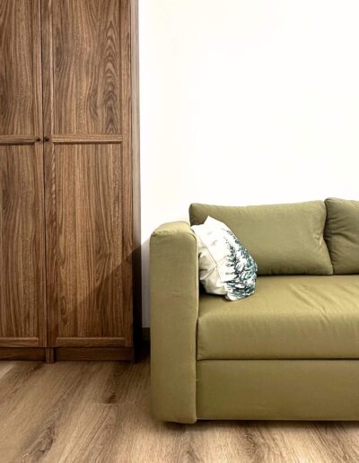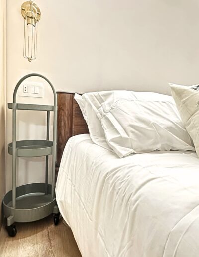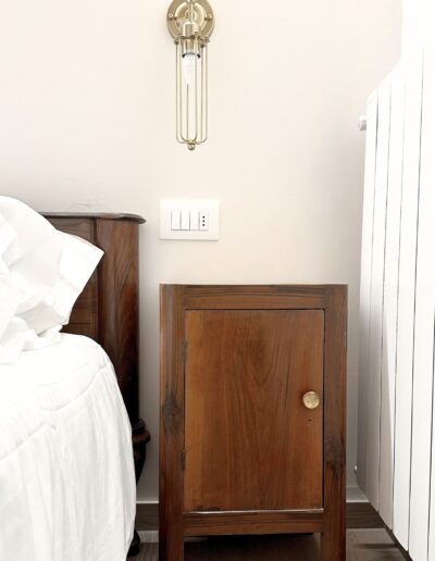 L’Anima del Recupero: Il cuore del progetto risiede nel riuso consapevole. Abbiamo trasformato arredi vintage — come l’armadio e la cucina — attraverso una laccatura beige freddo, e dato nuova vita a pezzi di recupero per la zona notte e il bagno.