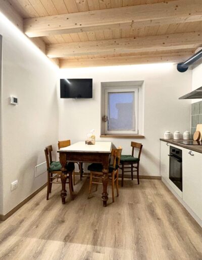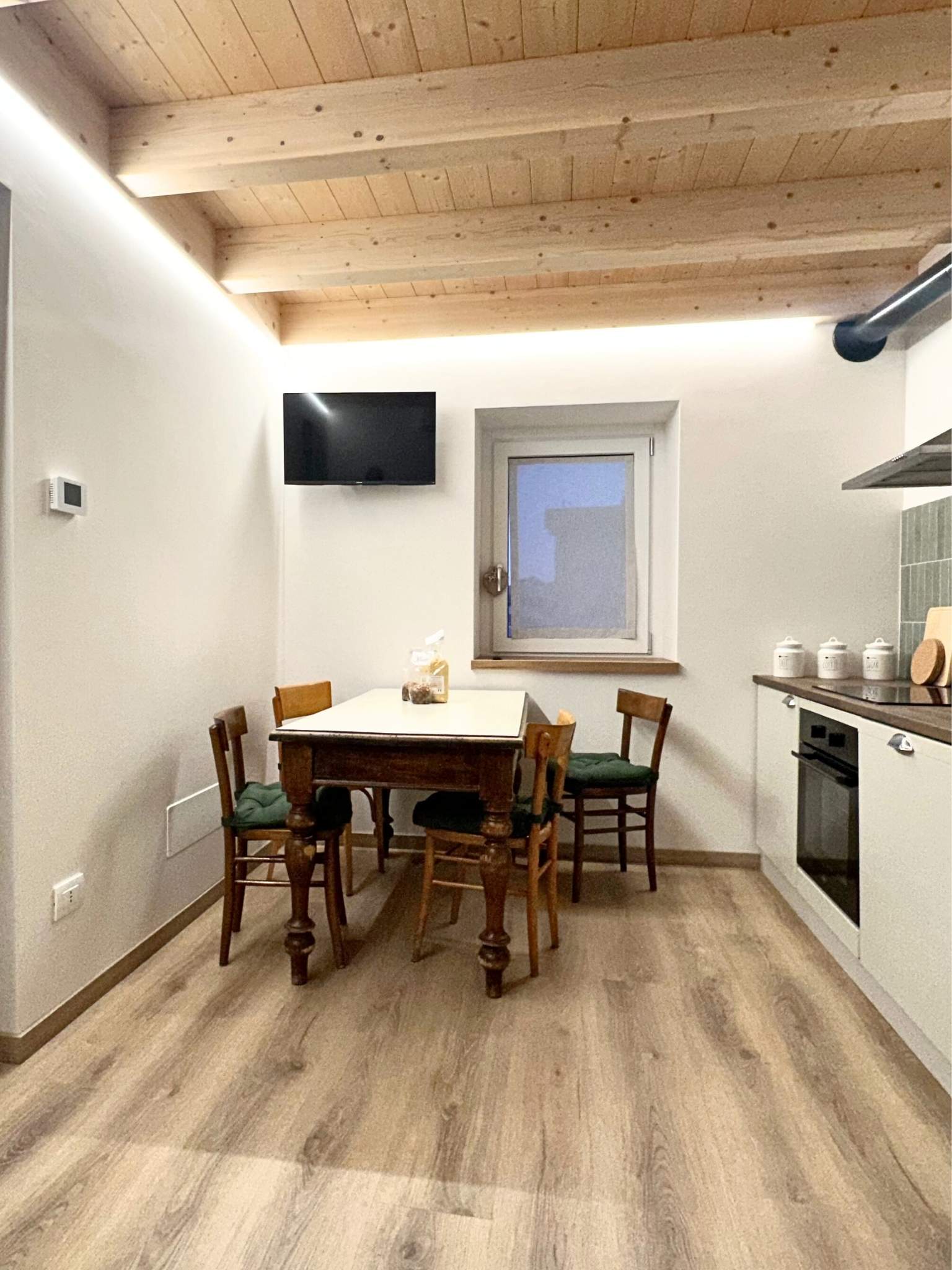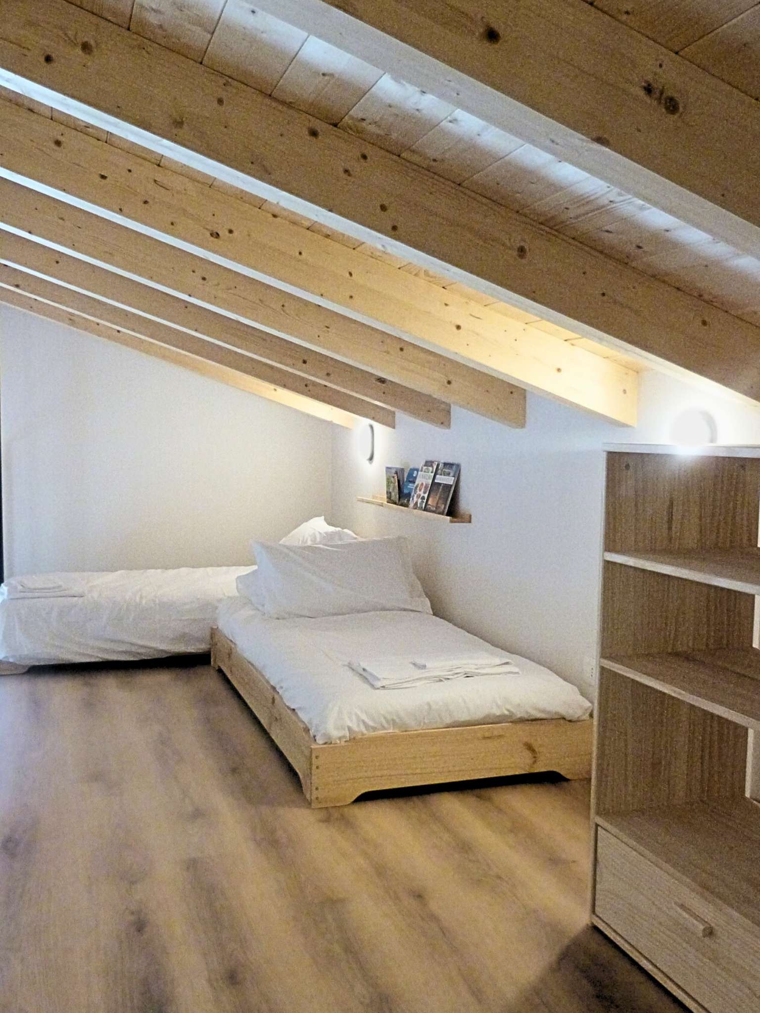 Materiali & Texture: Il soffitto originale in legno naturale fa da contrappunto a un pavimento in SPC effetto rovere, scelto per garantire massima resistenza e praticità senza rinunciare alla texture naturale del legno.