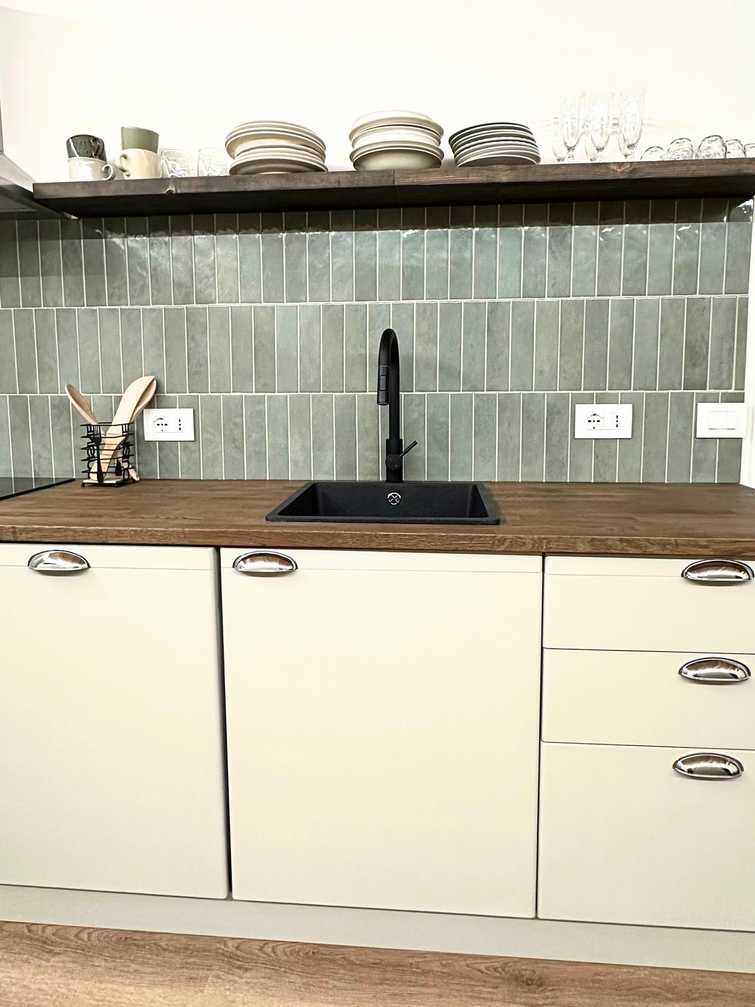 Palette Cromatica: Un gioco di contrasti equilibrati. La base è un Bianco Caldo che illumina le pareti, contrapposto al Verde Bosco e al Salvia delle ceramiche, con accenti in Beige Freddo e Nero Materico per i dettagli tecnici.